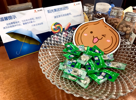 走近陽光前臺(tái),除了擺放整齊的各類登記表格,還有就是“陽光集團(tuán)歡迎您——請(qǐng)您享用美味糖果”、“溫馨提示——如您需要雨傘,可至前臺(tái)借用,用完后請(qǐng)及時(shí)將雨傘歸還”等,糖盆上還倚著手繪版笑容滿面的小洋蔥。