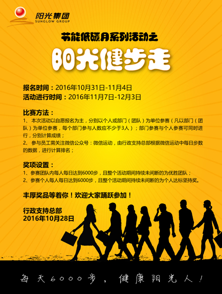 健步走被世界衛生組織認定為“世界上最好的運動”。為增強員工身體素質,倡導低碳出行理念,11月7日至12月3日,集團舉辦了為期一個月的“陽光健步走”活動。本次活動吸引了近30名集團領導及員工踴躍參加,員工們積極報名的同時還自發在手機媒介中成立了微信“走友圈”,為彼此助力加油。
