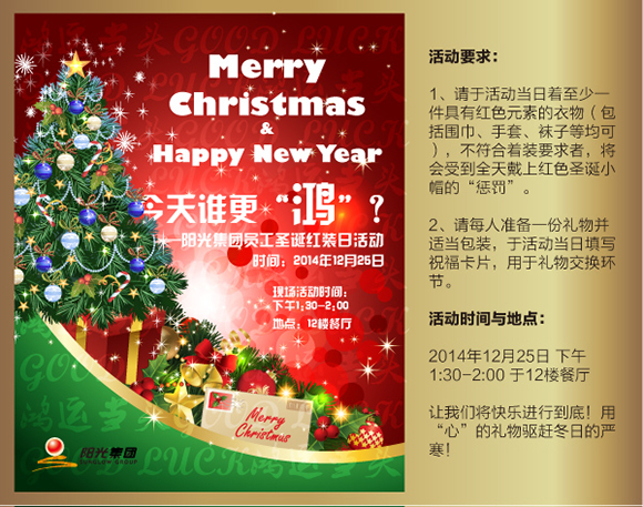 2014年12月25日,由集團行政支持總部發(fā)起,員工自發(fā)組織的圣誕紅裝日活動——今天誰更“鴻”圓滿落幕。絢麗的圣誕樹、晶亮的彩燈等裝飾都給大家留下了深刻的印象,圣誕氛圍溫馨暖人。